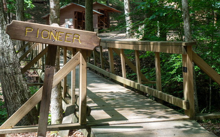 The Pioneer campsite has six lean-to shelters and is also suitable for tents. Each shelter contains four bunkbeds and mattresses. Pioneer is located a near the OA Lodge, OA Ceremonial Pool, Handicraft, The Council Ring, and the Trading Post. Pioneer is a wooded site with plenty of shade.